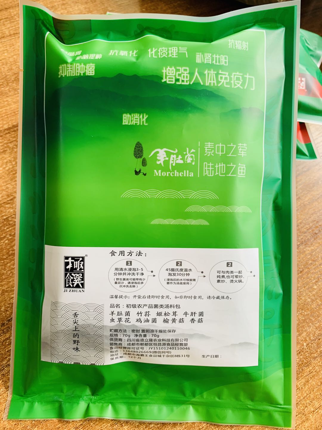 在羊肚菌干品一级批发的基础上,公司于2020年初开发出新品类“极馔”牌菌汤包,目前有70克、50克两种规格备选,目前与川内诸多社区平台深度合作推广,拓宽消费渠道,逐步探索羊肚菌初级加工产品生产销售。